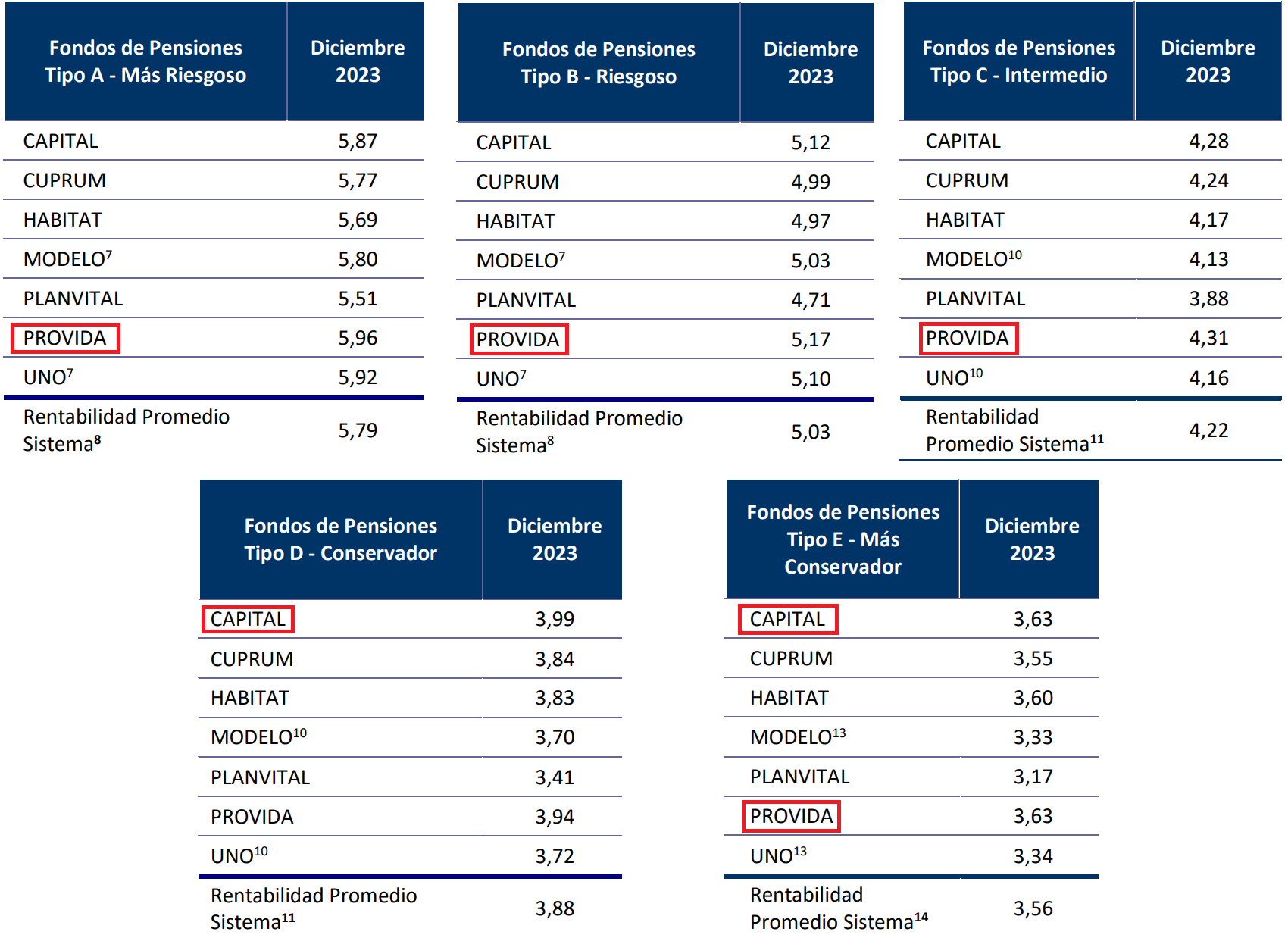 Durante el mes de Diciembre 2023, al igual que el mes anterior, PROVIDA les dio cátedra en inversiones al resto de las AFP, esta vez obteniendo la mejor rentabilidad en los fondos A, B, C y E. Esto demuestra el buen manejo que hacen tanto en renta fija como en renta variable dominando ambos espectros del nivel de riesgo. Asomándose tímidamente, AFP CAPITAL obtuvo la mejor rentabilidad en el fondo D e igualó en rentabilidad a PROVIDA en el fondo E.