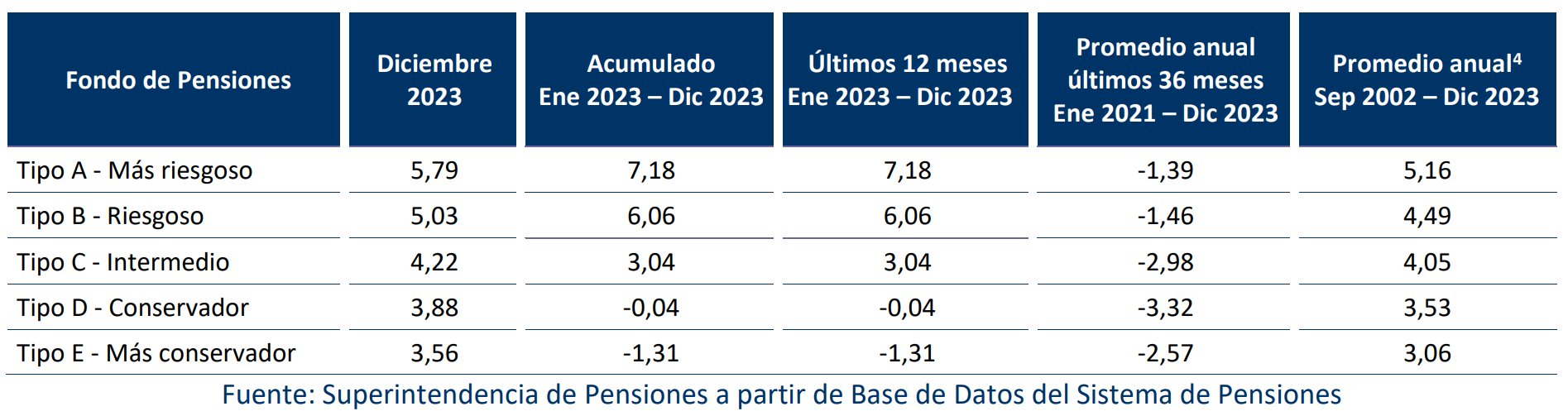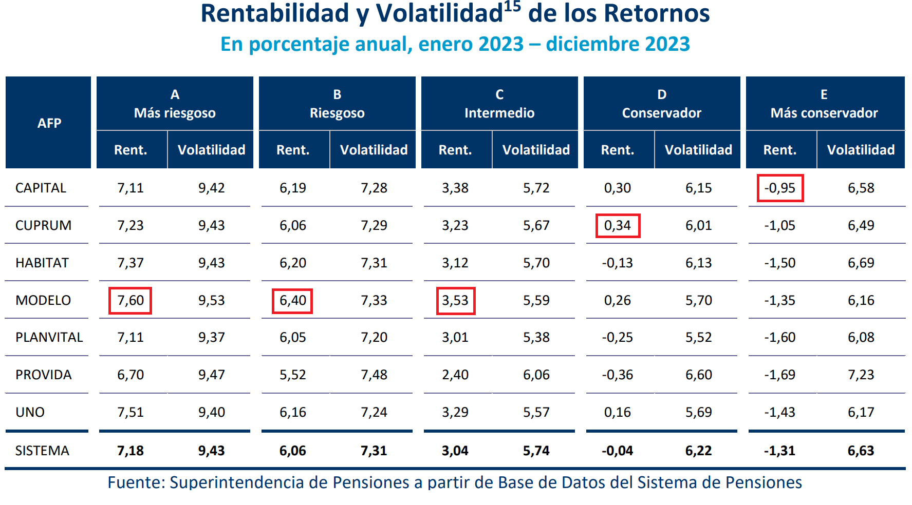 En el siguiente cuadro, en rojo mostramos la AFP que obtuvo el mejor desempeño para cada uno de los multifondos durante el mes de Diciembre 2023.