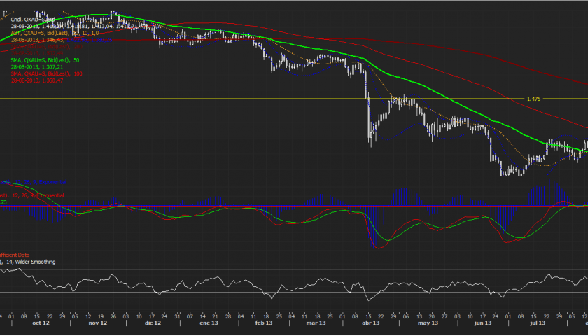 Analizando en gráfico, vemos que a partir de los primeros días de Julio 2013 el precio del Oro ha retomado una tendencia alcista de corto plazo.