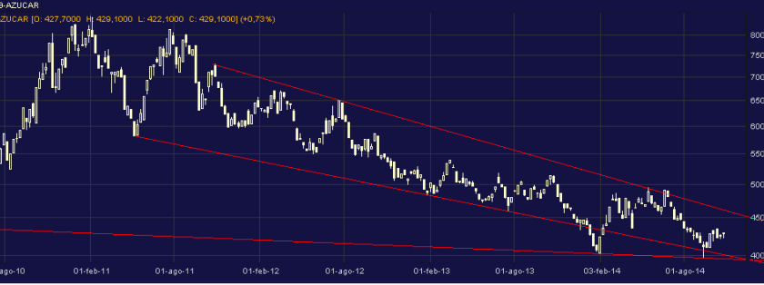 Comparativo precio de las acciones de IANSA y evolución del precio de la Azúcar N°5 usando datos semanales.
