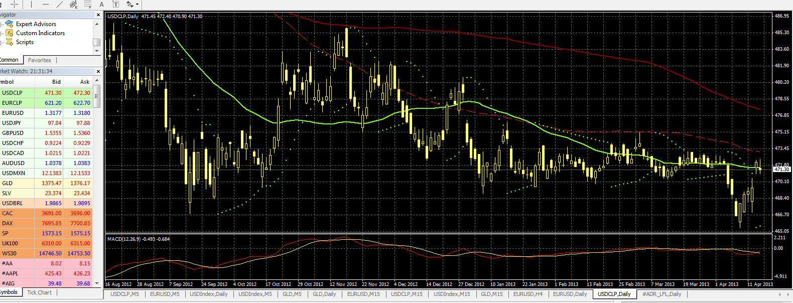 Otro tema que es recurrente en este tipo de plataformas de trading, es que mientras ocupas la versión demo para aprender del tema, los precios tienden a ser mucho más atractivos que cuando estás usando la cuenta con plata de verdad. Por ejemplo si va a ocupar la cuenta para tradear con monedas, euro-dólar o dólar-peso chileno, los precios que te da el sistema no son «reales» sino que están sucios por la comisión de corredor. En mi caso, en la cuenta demo y con la pantalla del terminal bolsa en frente, era común encontrar las puntas del dólar con spread de 20, 30 centavos de dólar hacia arriba para la compra y lo mismo hacia abajo para la venta. Esto significa que si yo iba a comprar dólares por la plataforma de trading, encontraba el dólar 0,20 – 0,30 más caro que la punta que me ofrecía el terminal de la bolsa de comercio de Santiago (solo los corredores o agentes financieros pueden tener terminal de monedas, no personas naturales, ni privados).