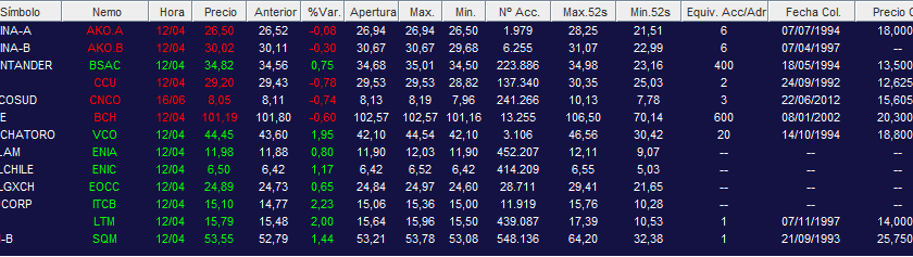 Valores ADR Chilenos al 12/04/18. admin hace 8 años Tweet Follow me Valor y resumen de las acciones de compañías chilenas en el mercado de Nueva York al 12/04/18. Publicaciones no relacionadas.