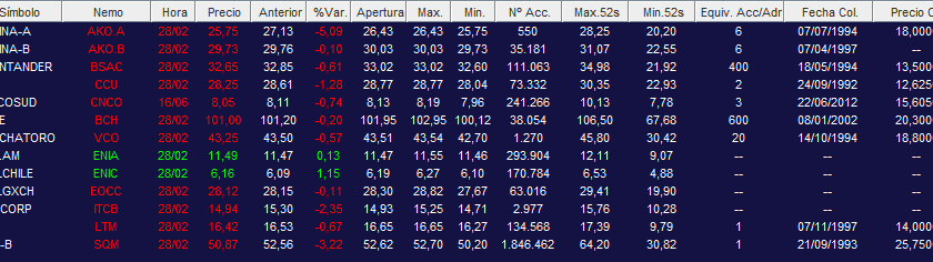 Valores ADR Chilenos al 28/02/18. admin hace 8 años Tweet Follow me Valor y resumen de las acciones de compañías chilenas en el mercado de Nueva York al 28/02/18. Publicaciones no relacionadas.