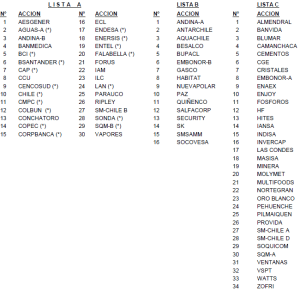 Con fecha 21 de Septiembre del presente año, la Bolsa de Comercio de Santiago ha publicado una actualización de la nómina de acciones para operaciones a plazo cómo simultáneas, ventas cortas, las cuales entran a regir a partir del 1 de Octubre del 2015.