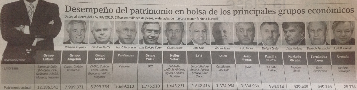 Patrimonio y Composición Principales Grupos Económicos. admin hace 12 años Tweet Follow me Resumen de las principales compañías de las que son dueños los distintos grupos económicos en chile. Valorización de sus empresas al 16/09/2013. Haz click en la siguiente imagen para agrandar: Publicaciones no relacionadas.