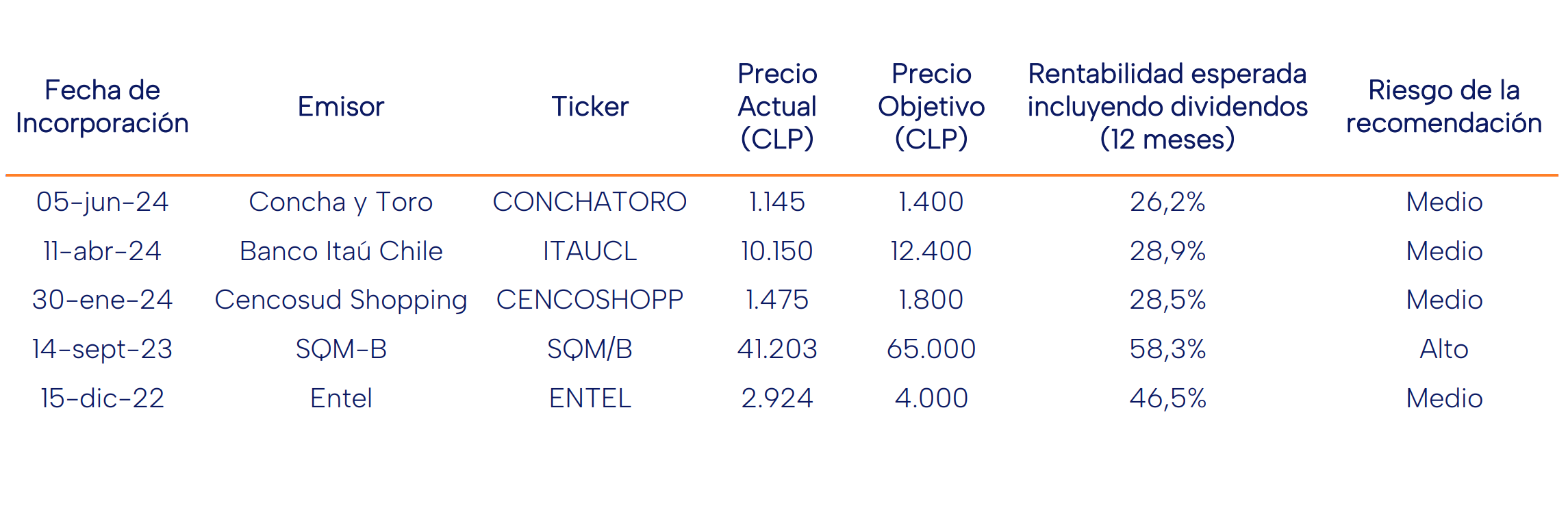 Se mantienen las recomendaciones en las acciones de ITAU, Cencosud Shopping, SQM-B y ENTEL.
