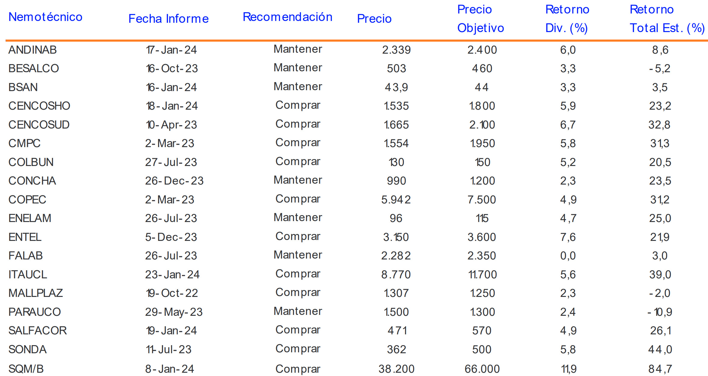 Con fecha 2 de Febrero 2024 se incorporó dentro de la Cartera de Acciones Recomendadas Chilenas las acciones de Cencosud Shopping, y se tomó la utilidad en Banco Itaú, saliendo en esta oportunidad del portfolio recomendado.