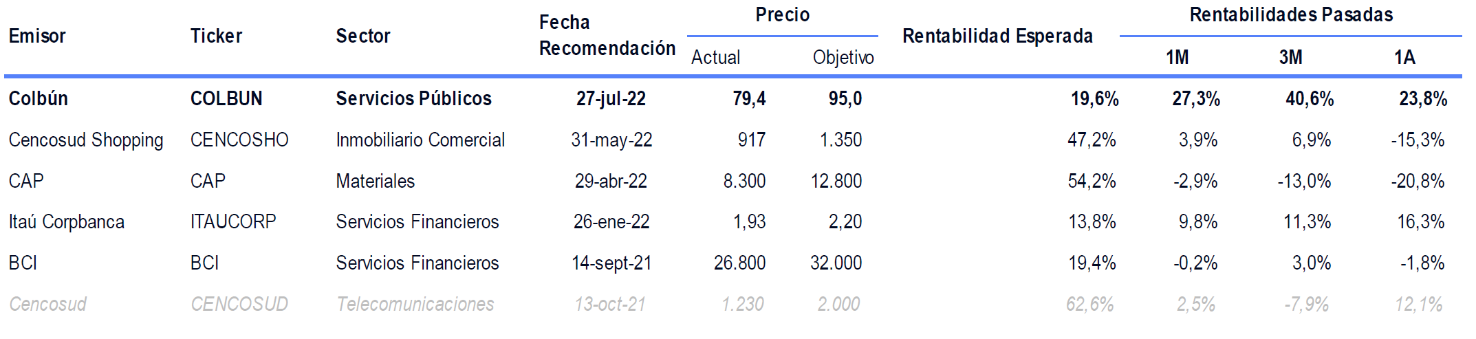 ***Con fecha 27 de Julio, se incorpora en la recomendación oficial las acciones de COLBUN con un precio objetivo de $95.-pesos, y se toma la utilidad en las acciones de CENCOSUD.