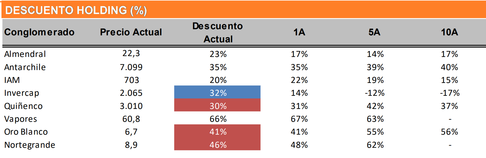 Según el siguiente cuadro, se destaca un desajuste significativo en las acciones de Invercap; Norte Grande, Oro Blanco y Quiñenco. Por desajuste significativo, se refiere a un +-10% por sobre el promedio de los últimos 5 años.