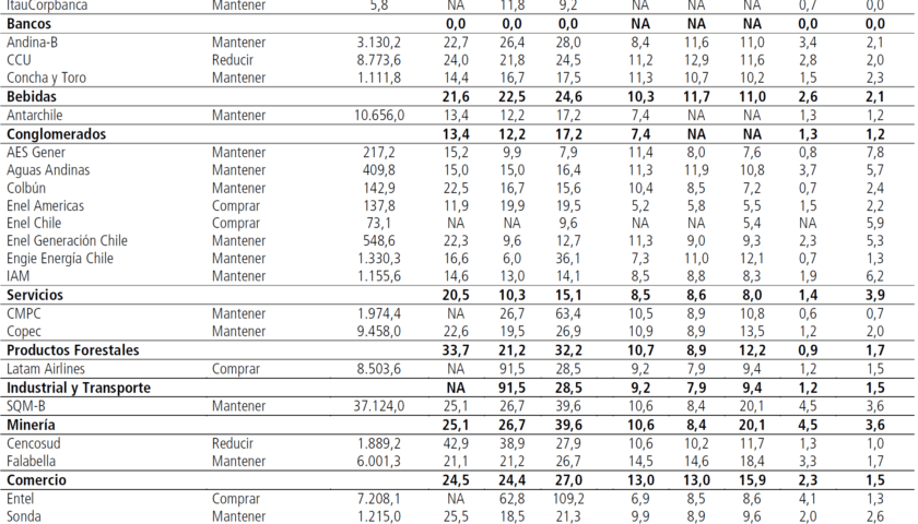 Recordar que «comprar» significa que la acción debería rentar mejor que el IPSA, «mantener» es similar al IPSA y «reducir» menor que el IPSA.
