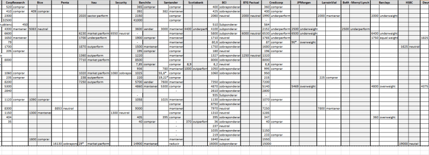 Resumen Precios Objetivos a Dic 2015 admin hace 11 años Tweet Follow me Adjunto listado de ultimas actualizaciones en los precios objetivos para la mayoría de las acciones chilenas, realizado por las distintas corredoras de bolsa. Publicaciones no relacionadas.
